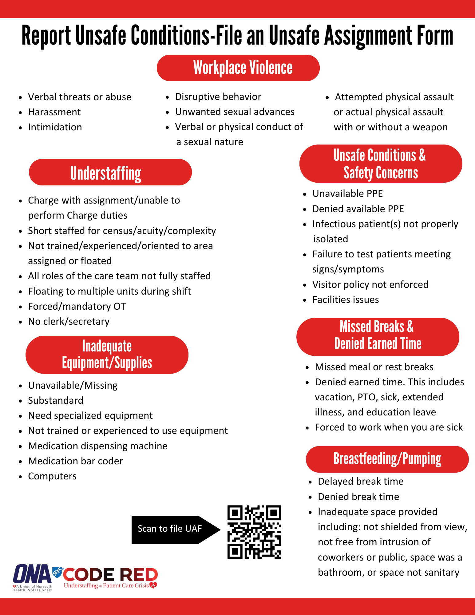 Nurses and health professionals who are not represented by the Ohio Nurses Association in a collective bargaining unit, may use the Unsafe Assignment Form (UAF). This form allows you to record an unsafe assignment and/or unsafe conditions. The form will send a timestamped email copy to the personal email entered into the form for your records. ONA will use this information in aggregate to support advocacy efforts statewide. Submissions will never be shared publicly with personal identifiers.